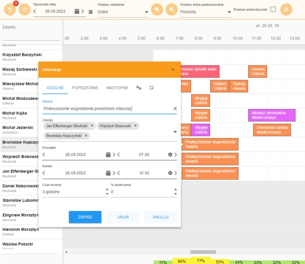 - oznaczasz priorytety, typy prac i branże techniczne przy użyciu czytelnych kolorów i ikon,